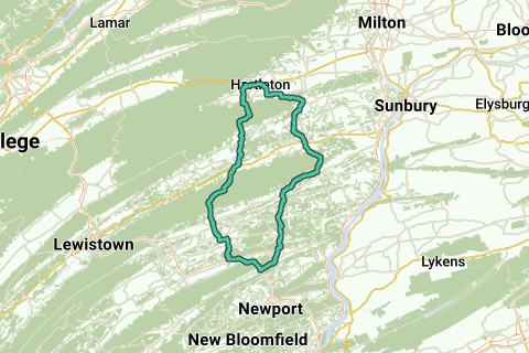Cet itinéraire pour les vélos de tour vous fait traverser le Saillant de Pennsylvanie. Le Saillant de Pennsylvanie est une région géologique qui est très facile à identifier si vous regardez depuis le ciel. C'est la courbe de la chaîne de montagnes des Appalaches (voir image satellite).