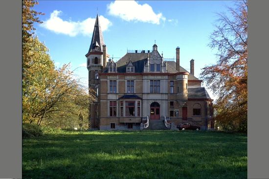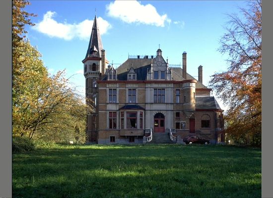 Iepersteenweg nr. 54-58. Soprannominato "Blankaart Kasteel", cf. attuale mappa catastale, situato in un ampio parco del castello di circa 10 ha. L'accesso alla tenuta è formato da un viale acciottolato a forma di ferro di cavallo fino al castello, bordato a sinistra da faggi rossi. L'attuale parco è incluso nella riserva naturale "De Blankaart", che oltre al parco comprende anche il cosiddetto Blankaartvijver (ca. 67 ha) e un certo numero di prati da fieno. Ca. 1561-1571: sulla Grande Mappa del Brugse Vrije realizzata da Pieter Pourbus è visibile una macchia blu allungata e irregolare all'altezza di quest'area. Questa macchia probabilmente indica un lago o almeno una zona allagabile risultante dall'estrazione della torba avvenuta nel corso degli anni, che risale almeno al 13° secolo. 1860-1870: il barone Gustaaf de Coninck de Merckem fa costruire nel suo recentemente acquisito dominio de Blankaart un castello eccezionalmente ricco ed eclectico su progetto dell'architetto Joseph Schadde (Anversa). Si tratta di un volume a forma di L di cinque campate e due livelli, con due torri semicircolari agli angoli e sul retro un'additione con una cappella neogotica e una torre poligonale più alta. Contemporaneamente alla costruzione del castello viene realizzato anche un parco del castello piuttosto ermetico in stile paesaggistico inglese con, tra l'altro, stalle per cavalli, una rimessa, una casa del giardiniere, un orto murato e serre. Alla fine del 19° secolo il Blankaartvijver, insieme all'ulteriore sviluppo del parco forestale, viene scavato e dotato di un'isola artificiale e di una cucchiaia per anatre. Nel parco del castello vengono anche creati un laghetto per pesci e una cisterna. In questa tenuta sono stati elaborati assi di vista, tra l'altro sopra il laghetto anteriore con ponte ad arco. Già intorno al 1900, l'area di Blankaart era conosciuta come un'area naturale eccezionale con elevato valore botanico e ornitologico a causa degli estesi canneti e margini d'acqua. 1914-1918: a causa della sua posizione vicina alla linea del fronte, il castello subisce danni tali durante la Prima Guerra Mondiale che rimane in piedi solo la facciata. Anche il parco forestale subisce gravi danni. 1925-1929: il castello viene ricostruito in una versione più piccola e sobria su progetto dell'architetto J. Gunst (Oostende). L'aspetto generale del castello con le sue due torri rotonde angolari, il volume della cappella e la torre poligonale viene rispettato. Il parco stesso non viene più ricostruito nel suo stato originale, causando la scomparsa di alcuni assi di vista. 1940-1944: durante la Seconda Guerra Mondiale il tetto del castello viene danneggiato. I tetti conici delle due torri rotonde non vengono più riparati. 1978: il dominio Blankaart viene dichiarato riserva naturale. Castello eclectico degli anni '20 con pianta grosso modo rettangolare. Volume di tre ampie campate e due livelli su piano seminterrato sotto un tetto di piastre in ardesia con cresta in ferro e camini alti. Ai lati fiancheggiato da torri angolari semicircolari con grondaia sporgente su console, tuttavia senza coperture coniche (cf. supra). Costruzione in mattoni rossi in combinazione con l'uso di pietra naturale bianca, tra l'altro per il basamento, la ritmica verticale tramite risaliti in pietra naturale continui con finestre di coronamento, la cornice continua e elementi decorativi. Risalito centrale pronunciato con scala a gradini a forma di ventaglio in pietra blu. Porta ad arco centrale su cui le estremità sono ritmate verticalmente dalla sovrapposizione di due colonne a tre quarti in pietra blu e sopra di esse due pilastri scanalati con in mezzo una nicchia ad arco. Finestre del tetto collegate in cima di facciata di pietra naturale con lo stemma dei Coninck de Merckem. Le altre campate sono ritmate da finestre a tre luci in pietra naturale fiancheggiate da pilastri scanalati con capitelli compositi e sulle parapetti sono scolpiti emblemi dell'agricoltura (raccolto) e della pesca. Simile, ma più sobria facciata posteriore asimmetrica con porta ad arco in risalito di pietra naturale continuo con pilastri collegati e facciata a punta sovrastante. A nord-ovest, torre scala poligonale aperta con sovrastruttura sporgente su console di pietra naturale con aperture tonde ad arco e cima della torre ottagonale. A sud-ovest, angolo accorciato con inserimento angolare di una cappella più bassa sotto un tetto a due falde in ardesia con chiusura della navata triangolare con contrafforti angolari tagliati. Interni suddivisi in modo più o meno simmetrico: vestibolo centrale con corridoio continuo con a destra una lapide commemorativa della fondazione del primo castello e a sinistra un'area scale con scala a sbalzo in rovere. Le altre stanze presentano rivestimenti interni in gran parte conservati: tra l'altro pannellature in rovere, porte a pannello, pavimenti in parquet, nicchie del camino e soffitti a stucco. Cappella con interni semplici con volta a crociera in legno e tre vetrate astratte del 1959 su progetto di Michel Martens (Brugge), cf. firmato. Inoltre, nel parco: ponte ad arco in ferro battuto, cisterna conservata, così come resti di antichi assi di vista, tra l'altro all'altezza dei cosiddetti prati del castello. A ovest confina con il Blankaartvijver: eccellente cucchiaia per anatre, utilizzata in passato per la cattura delle anatre. Con l'ausilio di un cane, le anatre venivano spinte in un tubo di cattura sempre più stretto, coperto in alto da rete metallica per pollame. HOUWEN P., De Blankaart e la sua storia, in De Belgische Natuur- en Vogelreservaten, 25° Bollettino, 1977, p. 32-34. KESTELOOT E., Geologia e geografia di Blankaart, in De Belgische Natuur- en Vogelreservaten, 25° Bollettino, 1977, p. 35-40. MEUL V., Joseph Schadde, accademico e maestro d'opera storicista nella seconda metà del 19° secolo, in Monumenten e Landschappen, jg. 13, nr. 6, 1994, p. 8-61. PRIEM V., Castelli e ville nella regione occi