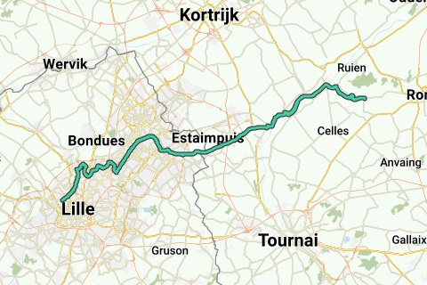 Segui il canale della Deûle e poi gira a destra sul canale di Roubaix. Oltre il confine, il nome cambia in canale di Spiere prima di confluire nell'Escaut. Nel villaggio di Escanaffles lasci le sponde dell'Escaut e segui il Rhosnes verso il Kluisberg.