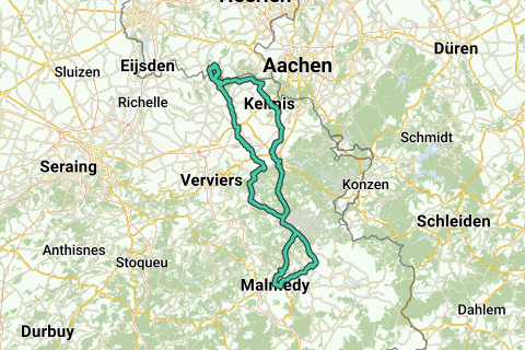 Partenza/fine: De Zegelskoel, Heijenratherweg 22, Heijenrath. Salite: Gulpen Hombourgh/Henri-Chapelle (B) 4.400 m., max. 5.0%. Rue Jean XXIII Baelen (B) 1.100 m., max. 5.0%. Côte de Barrage de la Gileppe Jalhay (B) 3.000 m., max. 8.0%. Baraque Michelle Jalhay (B) 8.600 m., max. 5.0%. Walk/Robertville/Signal de Botrange da Malmedy (B) 12.800 m., max. 11.0%. Rue des Ecoles Gemmenich (B) 500 m., max. 6.0%. Rue Terstraten Gemmenich (B) 750 m., max. 7.0%. Rue de Beusdael Sippenaeken (B) 2.800 m., max. 8.0%. Loorberg Slenaken 1.500 m., max. 8.0%. Nel percorso ci sono anche diverse salite senza nome. Dislivello: 1.722. Sosta caffè: ristorazione in Place Albert 1er, Malmedy (B) o Rue du Barrage/Rue Centre Robertville (B) (aperto tutti i giorni).