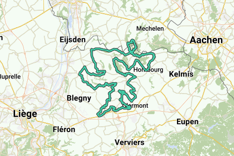 Partenza/fine: de Zegelskoel, Heijenratherweg 22, Heijenrath. Salite: Varnstraat Teuven (B) 1.300 m., max. 6.0%. Fêchereux (parte) Aubin (B) 1.400 m., max. 7.0%. Chemin des Crêtes St. André (B) 1.700 m., max. 6.0%. Croix de Charneux Charneux (B) 1.500 m., max. 11.0%. Haut-Vent Hervé (B) 500 m., max. 16.0%. Les Trixhes Froidthier (B) 900 m., max. 9.0%. Rue de Merckhof Aubel (B) 3.000 m., max. 7.0%. Rue Château Magis Aubel (B) 1.800 m., max. 5.0%. Magnebos Veurs (B) 2.200 m., max. 9.0%. Rue de la Station Hombourgh (B) 700 m., max. 15.0%. Rue de Beusdael Sippenaeken (B) 2.800 m., max. 8.0%. Loorberg Slenaken 1.500 m., max. 8.0%. Nella route ci sono anche diverse salite senza nome. Metri di dislivello: 1.563. Sosta caffè: Au Point Chaud, Rue de la Clef 74, Hervé (B) (aperto tutti i giorni).
