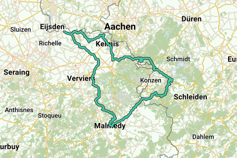 S.G.V. - S.M.V. - La Plancia - Teuven – Hombourg – Plombières – Völkerich – Moresnet-Chapelle – Kelmis – Hergenrath (30 km) – Astenet – Walhorn – Belven – Neudorf – Botz – Petergensveld – Roetgen - Dreilägerbachtalsperre – Waldsiedlung – Lammersdorf (60 km, panificio) – Paustenbach – Witzerath – Kesternich – Seifenauel – Rauchenauel – Dedenborn – Langscheider Strase – Croce Rossa – Alzen – Kalterherberg (97 km) – Küchelscheid – Vennbahn verso Sourbrodt-Gare – Andrifosse – Al Venne (Lago di Robertville) – Walk – Gdoûmont – Chôdes - Malmedy (117 km) - Bevercé - Mont - Hockai – Sart – Solwaster – Gospinal – Charneux – Jalhaye (143 km) – Foyr – Vervifontaine – Louveterie – Halloux – Limbourg – Honthem - Pingeren – Heggen – Welkenraedt – Henri-Chapelle – Merkhof – Hagelstein – Veurs – S.M.V. - S.G.V.