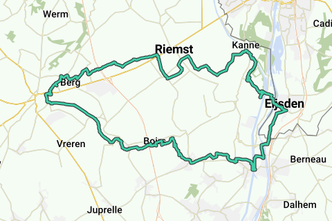 Partenza dal parcheggio della bella Piazza Nerems lungo la pista ciclabile separata verso Glons, proseguendo lungo la Jeker verso Bitsingen (Bassenge) e Boirs. Con una ripida salita fino al 19% verso Houtain Sant Simeone. Procediamo su strade poco trafficate scendendo verso Visé fino al Canale Alberto, lo attraversiamo e poi pedaliamo verso Eijsden (Paesi Bassi). Qui, lungo la Mosa, è il momento di un boccone e una bevanda su uno dei tanti dehors. Successivamente attraversiamo la Mosa con il traghetto per tornare in Belgio. È tempo per una nuova salita sulla Lanay per poi scendere lungo la Jeker fino al porto di Kanne. Ancora una salita sulla Slingerberg fino a Zichen e Zussen. Proseguiamo su strade ondulate verso Valmeer e il castello del vino di Genoelselderen. Terreno collinare fino a Ketsingen-Berg per arrivare a Tongeren, la città più antica del Belgio. Attraverso l'area naturale di Kevie, torniamo alla Piazza Nerems, dove possiamo gustare un buon pasto al Bistro Anthony's Taverne o una patatina al Brekske, oppure un drink sulla terrazza del caffè Derby da Marcel.