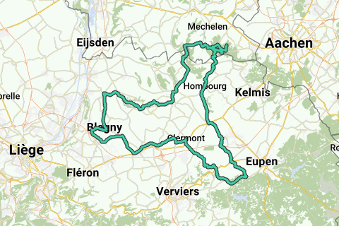 Tour Voerstreek 24 da Vijlen. Inizio/fine: boscafé 't Hijgend Hert, Rugweg, Vijlen. Salite: Rue de Sippenaeken, Sippenaeken (B) 2.600 m., max. 8,0%. Rue de Remersdael Hombourgh (B) 4.500 m., max. 5,0%. Route Jean XXIII Baelen (B) 1.100 m., max. 5,0%. Thier de Villers Bilstain (B) 1.300 m., max. 7,0%. Côte de Stockis Thimister (B) 1.500 m., max. 11,0%. Banchon Blégny (B) 1.500 m., max. 9,%. Clos du Grand Sart Mortroux (B) 1.700 m., max. 10,0%. Côte de Gaet St. Jean-Sart (B) 900 m., max. 6,0%. Côte de Hagelstein Aubel (B) 1.100 m., max. 6,0%. Gieveld Teuven (B) 1.500 m., max. 6,0%. Camerig ovest Vijlen 2.600 m., max. 8,0%. Metri di altitudine: 1.389. Sosta caffè: Au Point Chaud, Rue de la Clef 74, Hervé (B) (aperto tutti i giorni).