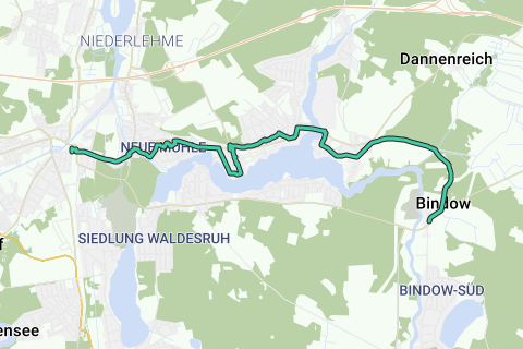 Torre dell'acqua - Tunnel per la Storkower Straße - Kirchsteig - Tiergartenstraße - chiusa Neue Mühle - a destra promenade lungo la Staabe - stabilimento balneare Neue Mühle - promenade lungo la riva - sentiero lungo la riva - al parco - a destra Am Teich - a destra Erlenweg - a sinistra Küchenmeisetrallee - a destra Karl-Marx-Straße - a destra Seestraße - proseguire su Rütgerstraße - oltre Karl-Marx-Straße e Segelfliegerdamm - alla ferrovia - a destra Hochstraße - a sinistra Karl-Marx-Streße - prima del passaggio a livello a destra Kablower Chaussee - oltre il ponte (Krüpelsee / Zernsdorfer See & Lankensee) - Zernsdorfer Straße - a destra Am Krüpelsee - a sinistra Fontanestraße - a sinistra Bindower Weg (DahmeRadweg) - attraverso l'area di riserva naturale e paludosa fino a Bindow - a destra Bindower Dorfstraße - a sinistra Grüne Trift (fermata dell'autobus di fronte al concessionario auto)