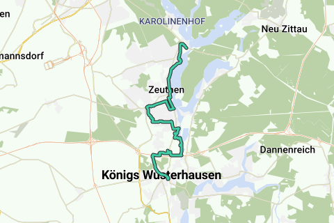 Adlergestell - attraversare l'incrocio semaforico - Godbersenstraße - a sinistra Lindenstraße - lungo la riva del lago Zeuthener verso Zeuthen - area di sosta con accesso al bagno - Friedenstraße - lungomare del lago Zeuthener - quartiere delle ville Niederlausitzstraße - piazza della democrazia con monumento commemorativo per le vittime del regime nazista - Dorfaue - Eichenallee - Platanenallee - Lindenallee - monumento commemorativo di Fontane sulle rive del lago Zeuthener - a destra Westkorso - passaggio a livello - a destra Birkenallee - Rheinstraße - a sinistra Hankelweg - chiesa in pietra Miersdorf - a sinistra ingresso della riserva naturale Höllengrund - a sinistra Wildbahn - a destra Fliederweg - a sinistra Magnolienweg (tenere sempre a sinistra) - a destra Freiheitstraße - Dorfaue - a sinistra Goethebahn - ponte dell'autostrada A10 - Funkerberg Königs Wusterhausen - Berliner Straße - parco del castello - castello di Königs Wusterhausen e case dei cavalieri - Gerichtsstraße - torri dell'acqua