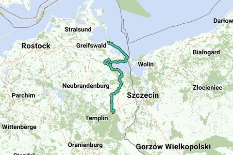 Percorso: Warnitz, Quast, Seehausen, Potzlow, Strehlow, Zollchow, Röpersdorf, Prenzlau, Ellingen, Schönwerder, Bandelow, Trebenow, Werbelow, Nechlin, Schmarsow, Rollwitz, Pasewalk, Viereck, Torgelow, Eggesin, Ueckermünde, Anklam, Pinnow, Usedom, Ahlbeck, Bansin, Ückeritz, Zinnowitz, Karlshagen, Peenemünde