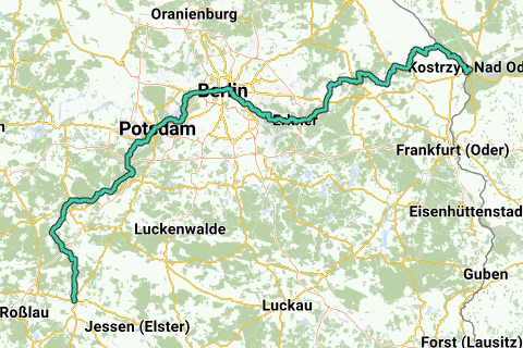 Partendo da Berlino, i ciclisti raggiungono presto la catena d'acqua di Grünheide. Il divertimento di fare il bagno è garantito qui durante la stagione calda. Il profilo piuttosto pianeggiante tra Erkner e Rehfelde si alterna con il paesaggio collinare del parco naturale della Svizzera Markese. Qui si scoprono angoli primordiali e quasi incontaminati con 250 specie di uccelli, castori e lontre. Si prosegue poi attraverso la pianura dell'Oderbruch, che garantisce affascinanti vedute panoramiche, e oltre il dike dell'Oder con vista sulla Polonia vicina. Lunghezza: 270 km (sezione Brandeburgo 185 km) Partenza: Città di Lutero Wittenberg Destinazione: Küstrin-Kiez Logo / Segno del percorso: cartello bianco con iscrizione verde "R1" Arrivo: Treno: da Berlino Hauptbahnhof con l'IC2185 (Leipzig) fino a Città di Lutero Wittenberg (ca. 45 minuti). Partenza: Treno: Da Küstrin-Kiez con l'RB26 verso Berlino Lichtenberg e proseguendo con la S7 fino a Berlino Hauptbahnhof (ca. 2 h). Percorso: Città di Lutero Wittenberg, Raben, Bad Belzig, Brück, Beelitz-Heilstätten, Werder, Potsdam, Berlino, Erkner, Rehfelde, Neuhardenberg, Letschin, Küstrin-Kiez Luoghi di interesse / informazioni utili: Raben: Chiesa del villaggio, Centro del parco naturale Hoher Fläming, Castello di Rabenstein Grubo: Chiesa in pietra di campo Bad Belzig: Casa Roger Loewig, Chiesa di Briccius, Castello Eisenhardt, Chiesa cittadina di Santa Maria, Parco termale Brück: Bagno naturale Beelitz-Heilstätten: Centrale termo-elettrica, Sentiero delle cime degli alberi "Albero & Tempo" Ferch: Chiesa dei pescatori, Museo della colonia di pittori dell'Havelland, Giardino giapponese Bonsai Petzow: Lavatoio, Castello, Parco della tenuta Potsdam: Casa delle macchine a vapore, Museo di storia naturale, Nuova piazza, Museo del cinema, Porto, Isola dell'amicizia, Chiesa di Nicola, Villa Schöningen, Ponte di Glienicke Erkner: Museo Gerhart Hauptmann Garzau: Piramide di pietra di campo Buckow: Centro curativo Kneipp, Casa Brecht-Weigel, Centro del parco naturale Casa svizzera Trebnitz: Castello con parco del castello, Museo Gustav Seitz Neuhardenberg: Castello con parco del castello, Chiesa di Schinkel Letschin: Stanza della patria, Torre di Schinkel Kostrzyn: Ex fortezza Possibilità di combinazione Percorso ciclabile Berlino-Leipzig Tour Brandenburg Percorsi ciclabili nei centri storici 4 Havel-Radweg Mauerweg DahmeRadweg Spreeradweg Tour Oder-Spree Tour dei castelli Marciani Radweg Oder-Neiße Radweg Condizioni del percorso / sviluppo della tratta: Il tour si snoda per lo più lungo le strade o come percorso condiviso pedonale e ciclabile, da Erkner anche su strade secondarie. L'intero tratto è per la maggior parte asfaltato, attorno a Buckow e tra Wulkow e Neuhardenberg si presentano tratti non pavimentati. Mappe / letteratura: "bikeline Radtourenbuch: Europa-Radweg R1: Da Arnhem attraverso Berlino a Küstrin sull'Oder", 1:75.000, Edizioni Esterbauer, Edizione: 5. edizione (12 giugno 2015), ISBN-13: 978-3850001298, 13,90 Euro