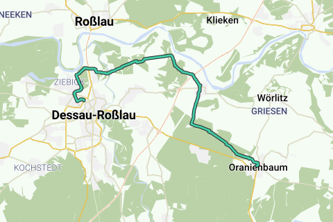 Uscite dalla città di Bauhaus di Dessau – Rosslau in direzione nord attraverso il Mulderadweg, alla Jagdbrücke incontrate il percorso ciclabile dell'Elba / cammino del Principe Francesco, che seguite in direzione di Vockerode. Dopo circa 8 km raggiungete Vockerode. Lasciate il percorso ciclabile dell'Elba e pedalate sulla pista ciclabile europea R1 passando per le aree libere per castori all'Auenhaus fino a Oranienbaum.