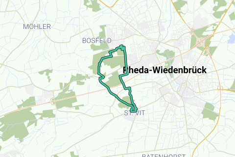 Il percorso ti porterà prima attraverso il bosco di St. Viter, quindi prosegue a sinistra lungo il Wieksweg fino a sinistra verso la Geweckenhorster Straße. Dopo attraverserai un ponte sopra l'autostrada A2. Dal ponte hai una buona vista sulle colline Stromberger a sud-ovest. A nord-est vedrai il quartiere di Rheda con la torre della chiesa cittadina evangelica. A destra dell'autostrada puoi vedere il quartiere di Wiedenbrück con la torre della chiesa di Aegidius e più a destra la torre della chiesa di Maria. Sullo sfondo, in giornate limpide, si possono vedere le montagne della foresta di Teutoburgo.