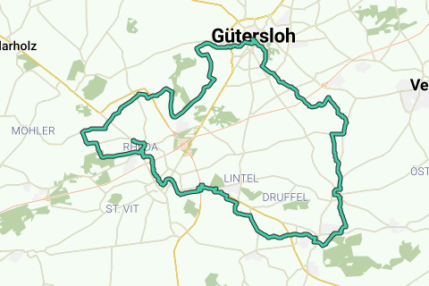 Ora l'itinerario porta a Gütersloh, oltre il gorgogliante Ölbach con il mulino ad acqua Delker, sotto tutela monumentale. Si attraversa il villaggio di Determeyer e si arriva alla casa contadina di Spexard risalente al XVI secolo, la più antica di Gütersloh. Nel centro città potrete ammirare l'architettura storica nel complesso a traliccio attorno alla chiesa degli Apostoli, nella piazza della vecchia chiesa. Successivamente, vale la pena visitare il museo cittadino con il suo unico caffè museo.