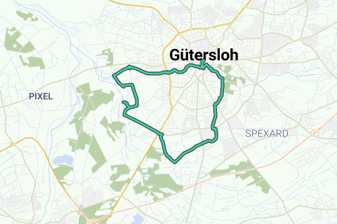 Inizialmente si procede lungo il sud della pista, anch'essa in direzione della città, lungo il Dalkepromenade. Ben presto il percorso conduce al tradizionale "Wapelbad". Il vicino "Kiebitzhof" con negozio agricolo e caffè contadino invita a soffermarsi. Si continua a pedalare attraverso il sud di Gütersloh e si passa per il parco cittadino con il suo unico Giardino Botanico e il caffè della serra. Chi cerca varietà può divertirsi a giocare a mini golf, lasciando le palline tuffarsi felici nelle buche. I ciclisti potrebbero anche desiderare un rinfresco nell'acqua bassa del "Parkbades"! Ora non ci vorrà molto prima di tornare alla "Weberei".