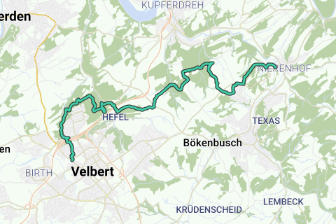 Appena abbiamo visto la Ruhr, ci troviamo già nel territorio comunale di Essen. Si prosegue attraverso l'antico Vallone di Asbach e poi di nuovo in salita con le prime viste sulla città delle chiavi e dei lucchetti, Velbert. Attraversiamo la A44 e il neanderland STEIG ci guida attraverso la foresta di Langenhorst e la valle di Rosenbach.