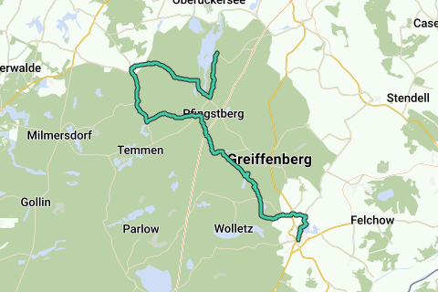 Percorso semplice: ca. 45 km / Angermünde − Kerkow − Görlsdorf − Steinhöfel − Stegelitz − Groß Fredenwalde − Böckenberg − Berkenlatten − Gerswalde − Kaakstedt − Flieth − Suckow − Warnitz