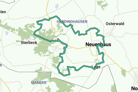 Aspettatevi paesaggi leggermente collinari fino a Schonevelds Mühle con caffè di molino e museo all'aperto. Si prosegue senza traffico verso il villaggio di Wilsum con una deviazione al Naturhof Buschwiesen. Prossima tappa: "Milchbar Wiggers", subito dopo la stazione kunstwegen Brüna‘s Heide. A Neuenhaus pedalate lungo il fossato e potete fermarvi presso "Haus Brünemann". Alla Dinkel attraversate con il traghetto "Haal over". Il percorso si snoda attraverso due stazioni kunstwegen fino al mulino ad acqua e al ristorante "Malle Mühle". Rinfrescati, pedalate verso il mulino di Nordbeck e la torre panoramica "Lönsberg", anche qui con possibilità di ristoro. Si prosegue verso il Bronzezeithof Uelsen attraverso il Blekker Hof-Café nell'area vacanze di Uelsen.
