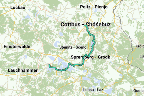La tredicesima tappa del Tour Brandenburg si snoda per 72 chilometri da Cottbus a Senftenberg. Il tour si muove attraverso Neuhausen lungo il lago artificiale di Spremberg fino alla città omonima. Attraverso il Lausitzer Seenland si prosegue fino a Geierswalde e poi a Senftenberg. Lunghezza: 72 km (4,5 h) Partenza: Cottbus / Arrivo: Senftenberg Logo / Segnale di percorso: aquila rossa di Brandeburgo su sfondo bianco. Come arrivare: Da Berlino Hauptbahnhof con il RE2 fino a Cottbus (circa 1,5 h). Partenza: Da Senftenberg con l'RB24 (Eberswalde) fino a Berlino Ostkreuz. Da qui continuare con la S5 fino alla stazione principale di Berlino (circa 2 h). Percorso: Cottbus, Frauendorf, Neuhausen, Bräsinchen, Sellesen, Spremberg, Proschim, Klein Partwitz, Geierswalde, Kleinkoschen, Senftenberg. Cose da vedere: Cottbus: Centro per i diritti umani e Memoriale del carcere, Parco di Spreeauen, Museo cittadino, Museo Wendico, Chiesa principale di San Nicolò, Torre di Spremberg, Chiesa parrocchiale di Santa Maria Regina della Pace, Museo delle farmacie di Brandeburgo, Museo d'arte della centrale diesel. Lago balneabile di Madlow. Spremberg: Chiesa della Croce, Museo del pascolo della Bassa Lusazia. Geierswalde: Lago di Geierswalde. Spiaggia di Großkoschen. Senftenberg: Porto cittadino, Zoo, Chiesa evangelica di Pietro e Paolo, Spiaggia di Buchwalde, Castello e fortezza. Possibilità di combinazione: Ciclabile Fürst-Pückler, Ciclabile del cetriolo, Tour acquatico / W krainie wody, Obiettivo Burg-Guben-Zielona Góra: Fiumi e paesaggi / Rzeki i krajobrazy, Tour minerario della Bassa Lusazia, Ciclabile del fiume Sprea, Verso piramidi e opere d'arte nella centrale elettrica Cottbus-Forst (Lausitz)-Zielóna Góra: Castelli e giardini, Percorso del paese dei laghi, Ciclabile della Elster Nera, Tour delle città giardini, Dal minatore al marinaio. Condizioni del percorso / Sviluppo del tracciato: Il tour consiste in piste ciclabili ben sviluppate, per lo più asfaltate. In ampie sezioni il Tour Brandenburg è già stato ampliato, segnalato e può essere percorsa senza restrizioni. Mappe / Letteratura: "Tour Brandenburg: Attorno a Berlino attraverso tutto il Brandeburgo", scala 1:75.000, ISBN 978-3850002141, Esterbauer, 3ª ed. (2014).