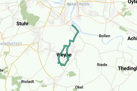 2. Seguite il sentiero di cammino della diga del Weser fino alla strada "Am Deich". Qui svoltate a destra. Seguendo dritto, arriverete automaticamente alla Kirchweyher Straße, che all'inizio si snoda parallelamente a un piccolo quartiere residenziale e in seguito lungo campi e prati incantevoli. Seguite questa strada per circa 1,6 km.