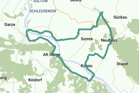 Dopo il traghetto sull'altro lato dell'Elba, le specie di uccelli possono essere scoperte dal vivo nel paesaggio. Nelle vicinanze della Storkenkate di Preten e nelle vicine Sudewiesen vivono i Koniks (cavalli) e i bovini Heck in armonia uno accanto all'altro. Proseguendo verso Neuhaus. Nella vicina Pforthaus vengono concessi sguardi sulla storia recente. Da lì si pedala verso Konau. Qui si trovano l'info turistica e l'Archezentrum Amt Neuhuas con molte informazioni sulle razze di animali da allevamento antiche. Konau-Popelau è un villaggio marsch con molte tracce del passato di confine tedesco-tedesco. Lungo l'Elba si va verso Darchau, da dove il traghetto Elba vi porta a Neu Darchau oltre l'Elba. Dall'altra parte dell'Elba, nel vecchio centro del villaggio di Walmsburg, si riconosce ancora il centro storico protetto del villaggio a forma rotonda. Poco prima di Alt Garge, l'acqua della piscina nel bosco invita a una sosta. Nel centro del villaggio, una stazione di draisine invita a un breve giro. Da lì si torna a Bleckede.