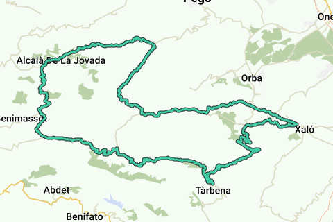 Scopri tutti i vantaggiCon le lancette dell'orologio si pedalano prima verso Parcent attraverso strade secondarie (attenzione: il sabato c'è il mercato a Jalón, e allora la strada è bloccata, devi prima attraversare a piedi il mercato o seguire la strada principale verso Alcalalí). Poi si affronta il meraviglioso Coll de Rates. Dopodiché si scende verso Tarbena attraverso un bellissimo paesaggio montano e seguono delle salite, che presentano molto meno dislivello rispetto al Coll de Rates (massimo 200 metri di dislivello), attraversando diverse catene montuose lungo il percorso. Quindi si sale attraverso il Collado de Bixauca, si scende a Castell de Castells, si sale gradualmente verso Facheca e si affronta la breve ascesa del Puerto de Tollos. Dopo la discesa dal Puerto de Tollos si pedala attraverso un altopiano ondulato (attenzione: ci sono sali e scendi con tratti brevi e ripidi (fino al 12%)) e infine si scende ripidamente verso Vall d'Ebo. Poi si affronta il Pla de Petracos (la discesa attraversa un'area splendida con molte rocce lungo la strada) verso Benigembla e si scende gradualmente indietro verso Jalón (con una breve interruzione a causa di una breve salita da Benigembla a Murla). Praticamente tutta la strada passa attraverso tranquille strade principali.
