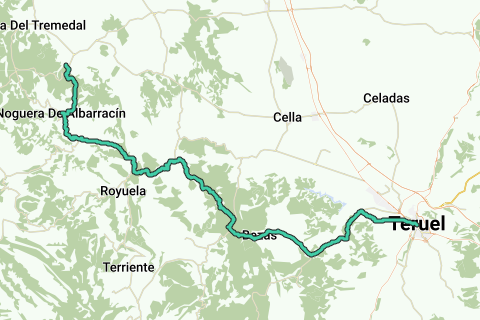 Da Bronchales ancora qualche km in salita fino al Puerto de Villarosario (1705m). Dopodiché si scende principalmente verso Albarracín, prima attraverso una zona montuosa, poi lungo il río Guadalaviar.