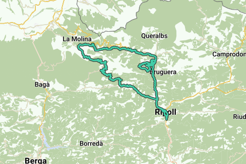 Dopo questa lunga discesa segue un anello (salita) verso Campelles, chiamato Collet de Cal Climent, dove puoi godere di molte viste sui dintorni. Campelles è un tipico borgo montano catalano con case in uno stile architettonico caratteristico. Fai un giro su strade in cemento in quota (che in alcuni tratti sono in condizioni peggiori) fino a El Baell (qui puoi mangiare), da dove la strada passa a un ottimo asfalto. Da El Baell scendi e solo gli ultimi 2 chilometri si percorrano sulla stessa strada che hai salito. Prosegui verso Ripoll con una leggera discesa lungo la trafficata strada principale N260 nella valle del fiume El Freser.