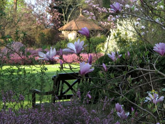 Questo "Giardino notevole" ha un dolce profumo di paradiso: bellissimi sentieri erbosi che si snodano tra eleganti tappeti di erica rosa, bianca e malva; un giardino di sottobosco dove si erge una venerabile quercia; due arboreti cinesi e americani dove si trovano cornioli, erica bianca e giallac'è un bellissimo sentiero erboso che si snoda tra eleganti tappeti di erica rosa, bianca e malva; un giardino di sottobosco dove una venerabile quercia troneggia al culmine della sua età; due arboreti, cinese e americano, dove cinorrodi, magnolie e conifere sono protagonisti al variare delle stagioni; un giardino zen segreto dove un piccolo stagno di ninfee vi cullerà all'ombra dei pergolati, oltre a un roseto con mille rose antiche e un delizioso orto? Tutto questo è mantenuto dal talento e dalla