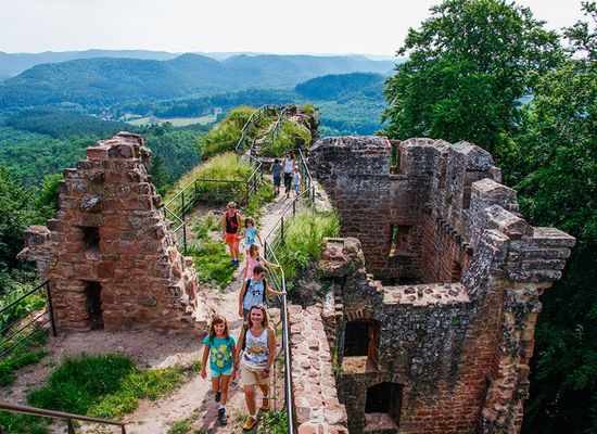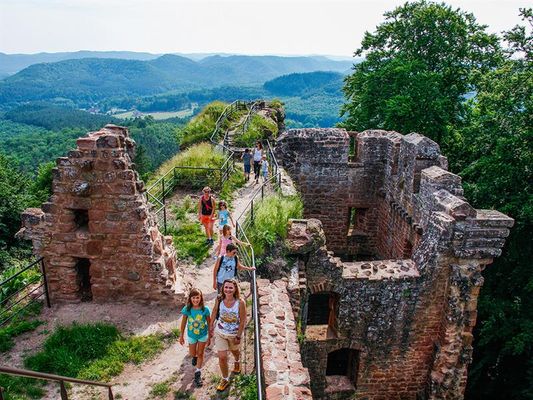 Il castello di Falkenstein è il più importante del Pays de Bitche. Fu costruito nel XII secolo per ordine del conte di Lutzelbourg per proteggere i suoi possedimenti nella Foresta Santa di Haguenau. L'ultimo dei signori di Falkenstein vendette il castello a Filippo IV di Hanau Lichtenberg nel 1564. Poche settimane dopo la vendita, il castello fu distrutto da un violento incendio causato da un fulmine. L'edificio bruciò per cinque giorni e cinque notti. I pochi edifici frettolosamente ricostruiti furono infine smantellati dai francesi nel 1680. Il percorso di accesso è segnalato da Philippsburg. Dal parcheggio dell'Office National des Forêts, accanto alla strada, si raggiunge la rovina in venti minuti. La rovina corona una ripida roccia di arenaria rosa, lunga 117 m, larga da 2 a 10 m e alta 22 m. Una volta varcato il cancello, sarete sorpresi dalla forma della roccia che sovrasta l'ingresso del cortile: sembra la testa di un falco (Falken = falco, Stein = roccia).