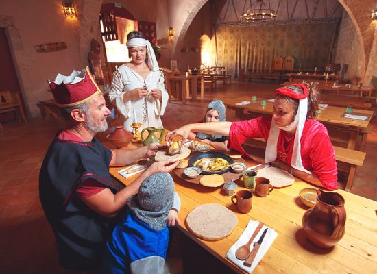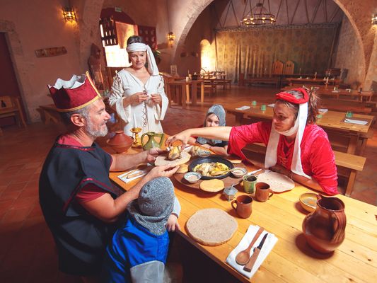 Audrey e Thierry vi aspettano in un ambiente tipico del XIV secolo al piano terra del castello, dove verranno preparate ricette medievali e carni arrostite.