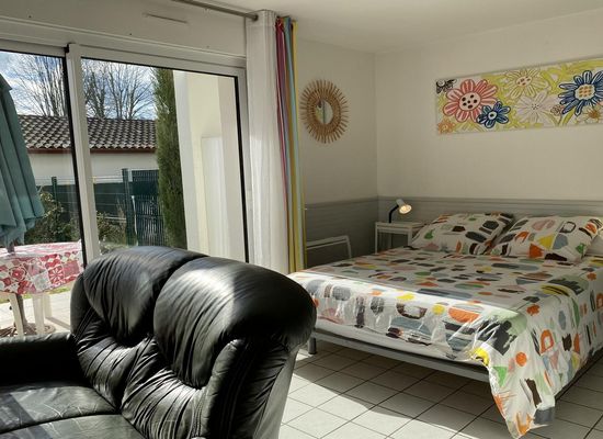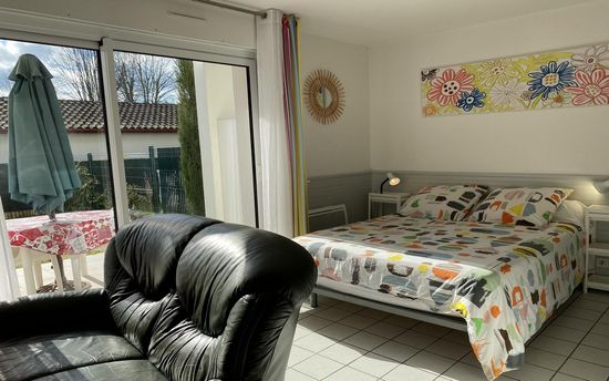 CAM 184: Situato al piano terra di un piccolo residence, questo monolocale climatizzato è situato in posizione ideale a pochi passi dal centro città e dalla navetta per le terme, e dispone di una terrazza di 45 m2 e di un giardino privato. È composto da un angolo cottura dotato di forno a microonde, piano cottura in vetroceramica e forno tradizionale e frigorifero superiore. L'angolo cottura si apre sulla zona soggiorno, che dispone di un letto matrimoniale (140 cm), televisore, 1 divano, 1 tavolo e 2 sedie. Il bagno con doccia è dotato di doccia, lavabo e WC. Esterno: parcheggio, terrazza con mobili da giardino, piccolo giardino.
