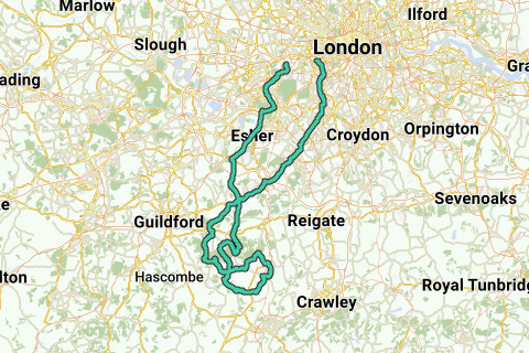 Durante il tragitto ci sono viste spettacolari, strade rurali ripide, scure e strette, curve acute, un sacco di angoli ciechi in alcune strade. Sezioni veloci - da Londra a Cobham e da Ewell a Londra, lente nella maggior parte del percorso intermedio. Divertente.