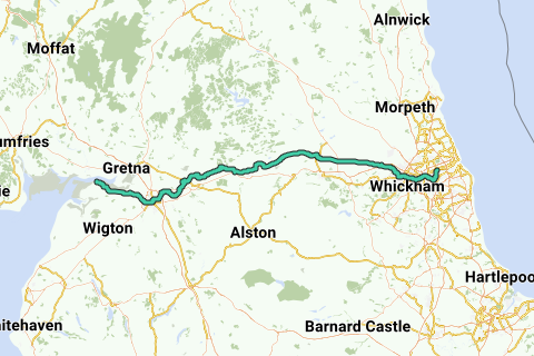 Percorso in bicicletta da corsa lungo il Vallo di Adriano da ovest a est. Questo percorso cerca di rimanere il più possibile vicino al muro su strade adatte alle biciclette da corsa.