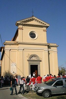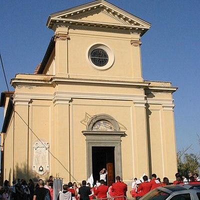 Fu eretta nel tardo Ottocento dall'architetto Giulio Bernardini che si ispirò al Duomo di San Miniato. Sostituiva l'antica chiesa di San Pietro di cui oggi vediamo i resti, costruita nel 1520 " in luogo vicino alla diruta chiesa di san Pietro " e consacrata nel 1542 con dedicazione oltre che a san Pietro a san Jacopo, fra quelle che dipendevano dalla Pieve di San Giovanni Battista a Corazzano.