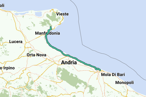 <p><a class="routeYou_embed" href="https://app.routeyou.com/it-it/route/view/6652938?utm_source=embed&utm_medium=article&utm_campaign=routeshare&navigation=external" title="Bari - Monte Sant'Angelo - RouteYou" target="_blank"><img src="https://image.routeyou.com/embed/route/960x670/6652938-it@2x.png" style="width: 100%; height: auto;" alt="Bari - Monte Sant'Angelo"></a></p>