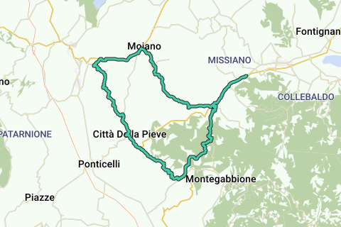 Itinerario che parte da Tavernelle passa per Monte Leone d'Orvieto, Città della Pieve (splendido borgo medioevale), fino a tornare a Tavernelle passando per Moiano.