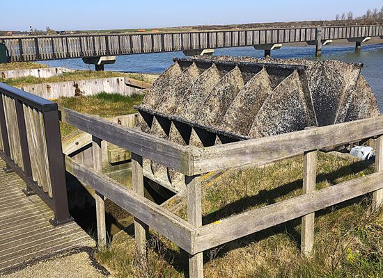 I molluschi sono coltivati nel canalone retrostante . Le ruote panoramiche, che funzionano con l'elettricità prodotta dai pannelli solari , riforniscono continuamente il canale di acqua fresca e quindi di nuovo cibo per la coltivazione dei molluschi.