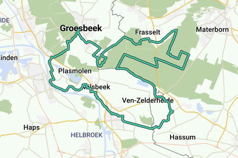 Inizialmente pedali attraverso le aree golenali della Mosa e il bacino del Niers, e lungo l'area naturale di Achterbroek su molte strade di ghiaia. Dopo una breve passaggio attraverso Mook, sali lungo la Papenbergseweg verso la Mookerheide: un stretto sentiero di ghiaia con a volte ghiaia sciolta (pneumatici più larghi sono utili qui in condizioni asciutte). In cima hai una vista splendida sulla Mookerheide. Continui a pedalare su strade di ghiaia attraverso i boschi tra Mook e Groesbeek.