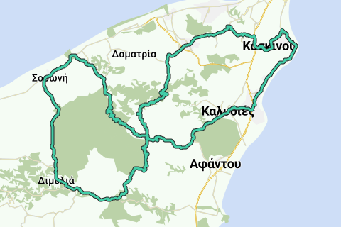 La strada sale ripida verso Psinthos e si snoda lungo Archipoli e Eleousa. A Dimilia troverai boschi ombreggiati 🌳 e aria fresca di montagna.