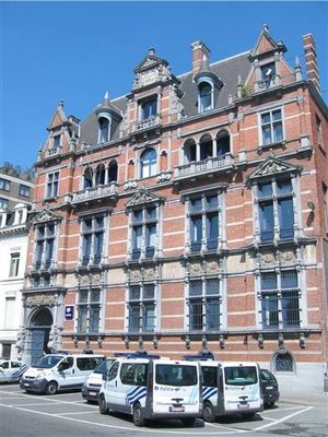 vleugeldeur met zwaar paneelwerk. Interieur: monumentale neorenaissancistische trapzaal met bovenlicht, marmeren vloeren, portieken en trapleuningen, l.g. met bronzen balusters, stucwerk, originele houten binnendeuren met paneelwerk.