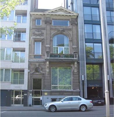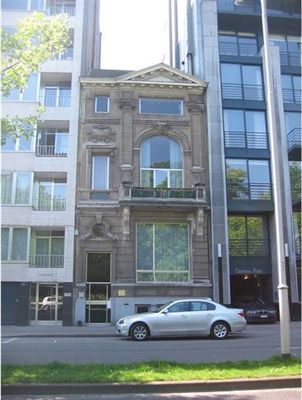 Nr. 27: Neoclassicistisch enkelhuis van twee traveeÙn en twee bouwlagen n.o.v. J.B. Vereecken en zoon (cf. inscriptie), van ca. 1900. Natuurstenen lijstgevel met geblokte begane grond, bredere rechter travee met balkon, aflijnende pilasters en