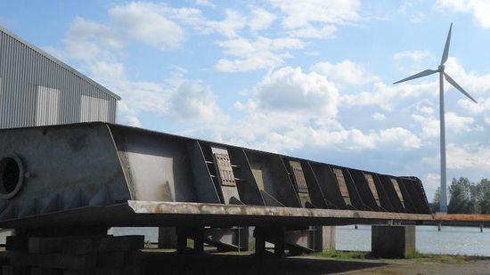 Sluizencomplex aan het zeekanaal van Zemst; windmolen op de achtergrond; reservesluisdeur op de voorgrond