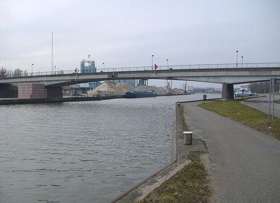 De huidige brug werd gebouwd in spanbeton en verving een baileybrug die gedurende de aanleg geopend bleef voor het verkeer. Deze oude brug lag ten oosten van de huidige brug. De huidige brug bestaat uit drie overspanningen: twee zijoverspanningen over de wegen naast het kanaal, en een middenoverspanning van 61 m over het Albertkanaal.