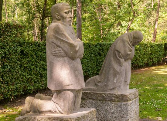 Onder de bomen van het immer zwijgende Praetbos zorgen donkere tegels, nauwelijks uitstekend boven de grond, voor de rustgevende sfeer van een Japanse tuin. Op elke steen staan wel twintig namen. Eigenlijk is dit een massagraf. Hier liggen de stoffelijke overschotten van 25.638 Duitse soldaten. Tegen de haag aan de achterkant zien we twee geknielde, robuuste boerensilhouetten die, bevangen door verdriet, uit een schilderij van Permeke schijnen gekropen. Ze vormen het beroemde beeldenduo Het treurend ouderpaar van de Duitse kunstenares Käthe Kollwitz. Haar zoon Peter ligt hier ook begraven. Hij was achttien jaar toen hij sneuvelde.
