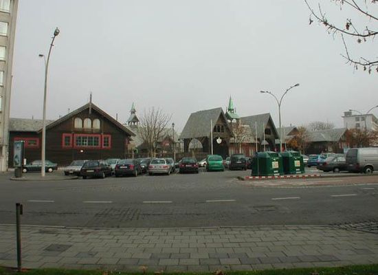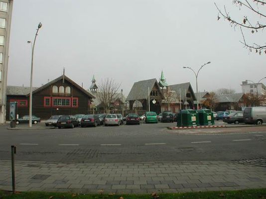 * Koninginnelaan nr. 74-78. Voormalige Koninklijke Stallingen naar ontwerp van Noorse architect I.A. Knudsen van 1903, ook z.g. "Noorse stallingen"; vanaf 1928 in gebruik als school, sinds 1959 als Sportcentrum. Beschermd als monument bij K.B. van 22/09/1981.Oorspronkelijke locatie binnen de oude stadskern tussen Van Iseghemlaan en Langestraat, nabij het "Oud Koninklijk Paleis" (cf. Langestraat nr. 69). Bouw van Koninklijk Chalet op grens met Mariakerke in 1873-1874, aanleiding tot verhuizing van stallen naar omgeving van nieuwe koninklijke residentie, voorlopig aan de nieuw aangelegde Wellingtonstraat. In 1877 tekent Engelse architect W.J. Green, tevens ontwerper van Koninklijk Chalet, plannen voor nieuwe stallen. Project niet uitgevoerd vermoedelijk tengevolge van beslissing Leopold II om het paviljoen van de koningin naast het zijne op te richten door een andere architect. Nieuwe plannen voor stal- en koetsgebouwen aan Koninginnelaan resp. naar ontwerp van Franse architecten A. Marcel, Coulomb en Chauvet in 1902, eveneens niet uitgevoerd. Uiteindelijke realisatie naar ontwerp van Noorse architect I.A. Knudsen, ontwerper van het paviljoen van Noorwegen op de Wereldtentoonstelling van 1900 te Parijs en tevens van het nu verdwenen houten chalet in het Koninklijk Domein te Raversijde. Voltooid in 1904, evenwel nooit in gebruik genomen als stalling. In 1929 intrek van stedelijke technische school en in 1959 verbouwd tot stedelijk sportcentrum. Deels ingebouwd rechthoekig hoekcomplex bij Kaïrostraat. U-vormige opstelling met stalvleugel ten noordoosten en remises rondom binnenplaats met poortgebouw tussen hekken aan straatzijde. Markante houten constructie met overstekende leien zadeldaken. Opbouw met houten zuilen, opengewerkte dakspanten, bebording, dakruiters en poorten onder puntgevel met windveer verwijst min of meer naar de Noorse "stavkirke". Verzorgde houtbewerking, zowel binnen als buiten, in z.g. "Dragenstilen", een Scandinavische art-nouveau-interpretatie van de Vikingstijl cf. steeds terugkerende knoop- en kepermotieven, draakvormige balksloffen. Aanpassingen tengevolge nieuwe functie cf. o.m. her en der ingebrachte plafonds en bijbouwen. AFDELING ROHM WEST-VLAANDEREN, Cel Monumenten en Landschappen, Archief nrs. DW000408, W/00466 en W/00973.LOMBAERDE P., Leopold II. Koning-bouwheer, Gent, 1995, p. 92-93.