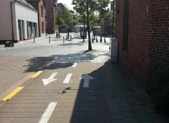 Einde van het fietspad en begin van de "shared space". Verwarrend. Waar moet ik fietsen? Op de boom dan maar...?