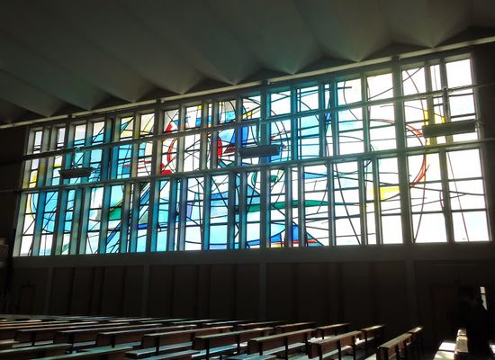 Het grote glasraam van Daniel Theys 'De Schepping' (2002) in de kerk van Haacht Station.