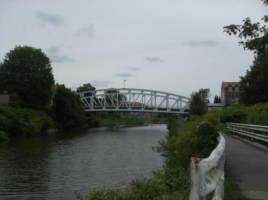 Van ver zie je de brug over de Leie ter hoogte van Komen/Comines.