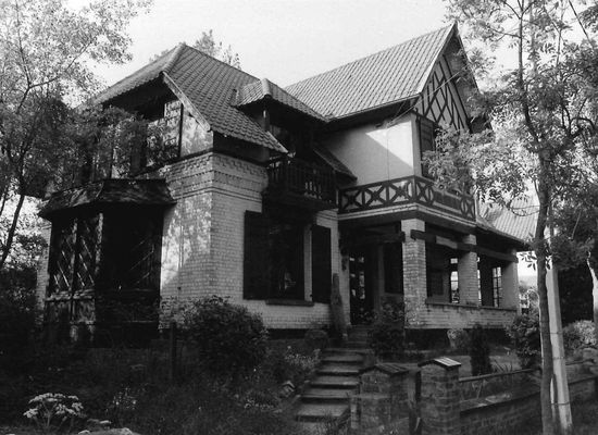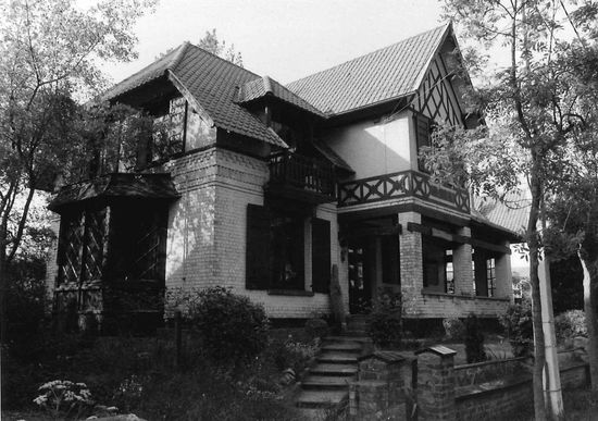 Identieke cottages midden laag ommuurd tuintje; middenrisaliet in vorm van uitspringend portaaltje met bekronend dakvenster, uitlopend op puntgevel; bakstenen gebouw met bepleisterde gedeelten voorzien van pseudo-vakwerk; baksteenfriezen ter aflijning van benedenverdieping; houten erker met ruitvormige roedeverdeling tegen linker zijgevel.