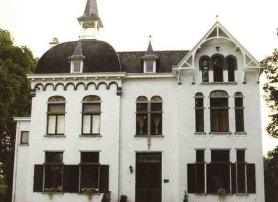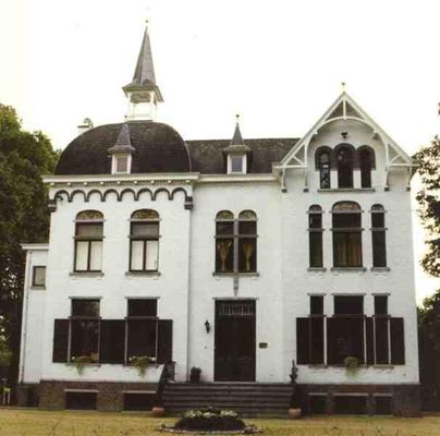 Alleenstaand, onderkelderd landhuis van vier traveeën en twee bouwlagen onder complexe bedaking (kunstleien) met opengewerkte dakruiter in eclectische stijl met art-nouveau-inslag, in sgraffitopaneel 1909 gedateerd.