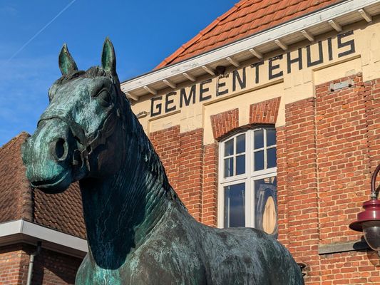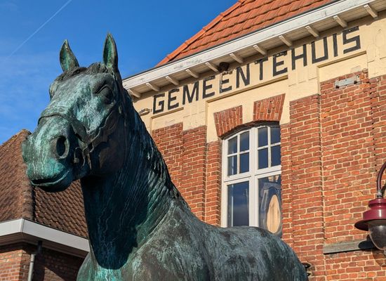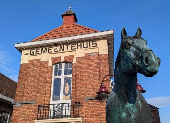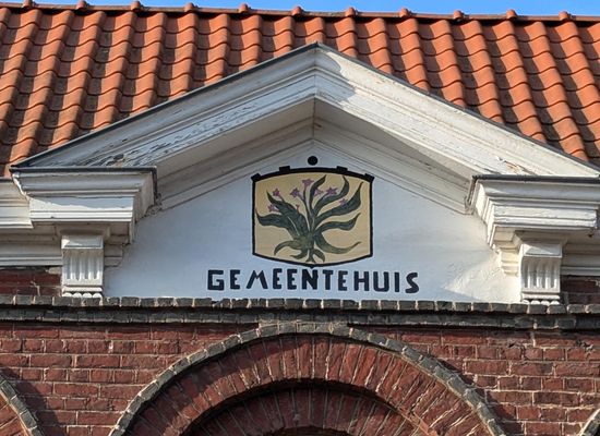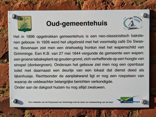 Het in 1896 opgetrokken gemeentehuis is een neo-classicistisch bakstenen gebouw. In 1926 werd het uitgebreid met het voormalig café De Swae- ne. Bovenaan ziet men een driehoekig fronton met het wapenschild van Grimminge. Een K.B. van 27 mei 1844 vergunde de gemeente een wapen: een groene tabaksplant op gouden grond, zich verheffende op een hoogte van sinopel (donkergroen). Onderaan het gebouw ziet men nog een openbaar toilet met daarnaast een deurtje van een lokaal dat dienst deed als lijkenhuisje. Rechtsonder de aanplakwand ligt er nog een roepsteen van waarop de veldwachter belangrijke berichten verkondigde.