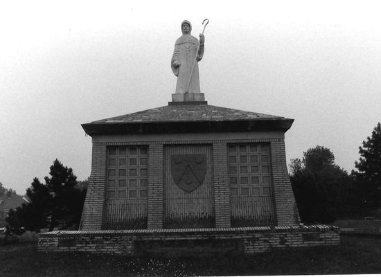 Witstenen beeld op geel bakstenen sokkel, geschraagd door middel van steunberen; arduinen wapenschild in voorzijde; arduinen gevelsteen met opschrift: "Aan St.-Idesbald van der Gracht. Heer van Eggewaartskapelle. Regent van het Graafschap. 3e Abt van Ten Duinen. 1155-1167". Gesigneerd en gedateerd "Ir. L. Deleye" (linkergevelsteen) en "Jos Witterwulghe, sculpteur 1953" (rechtergevelsteen).